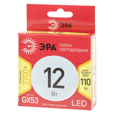 Тип цоколя : GX53 Оттенок света: теплый белый Мощность: 12 Вт Тип лампы: светодиодная Тип колбы: GX53 Вид колбы: матовая Минимальное рабочее напряжение: 170 В Максимальное рабочее напряжение: 265 В Мощность эквивалентной по световому потоку лампы накаливания: 110 Вт Световой поток: 960 Лм Цветовая температура: 2700 К Индекс цветопередачи: 80 % Срок службы: 30000 ч. Высота (длина) лампы: 22 мм Диаметр лампы: 75 мм