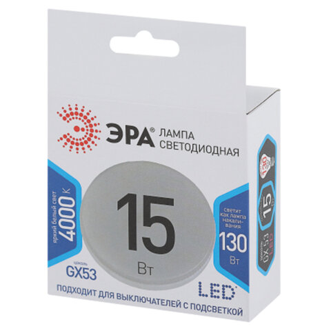 Тип цоколя : GX53 Оттенок света: нейтральный белый Мощность: 15 Вт Тип лампы: светодиодная Тип колбы: GX53 Вид колбы: матовая Минимальное рабочее напряжение: 170 В Максимальное рабочее напряжение: 265 В Мощность эквивалентной по световому потоку лампы накаливания: 130 Вт Световой поток: 1200 Лм Цветовая температура: 4000 К Индекс цветопередачи: 80 % Срок службы: 35000 ч. Высота (длина) лампы: 28 мм Диаметр лампы: 75 мм