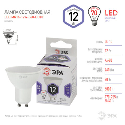 Тип цоколя : GU10 Оттенок света: холодный белый Мощность: 12 Вт Тип лампы: светодиодная Тип колбы: софит Вид колбы: матовая Минимальное рабочее напряжение: 170 В Максимальное рабочее напряжение: 265 В Мощность эквивалентной по световому потоку лампы накаливания: 110 Вт Световой поток: 960 Лм Цветовая температура: 6000 К Индекс цветопередачи: 80 % Срок службы: 35000 ч. Высота (длина) лампы: 56 мм Диаметр лампы: 50 мм