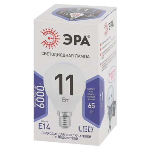 Тип цоколя : E14 Оттенок света: холодный белый Мощность: 11 Вт Тип лампы: светодиодная Тип колбы: шарообразная Вид колбы: матовая Минимальное рабочее напряжение: 170 В Максимальное рабочее напряжение: 265 В Мощность эквивалентной по световому потоку лампы накаливания: 100 Вт Световой поток: 880 Лм Цветовая температура: 6000 К Индекс цветопередачи: 80 % Срок службы: 35000 ч. Высота (длина) лампы: 90 мм Диаметр лампы: 45 мм