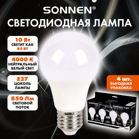 Лампа светодиодная SONNEN EXTRA, 10 (85) Вт, КОМПЛЕКТ 4 шт., Е27, нейтральный белый, 30000 ч, LED A60-10W-4000-Е27, 457893