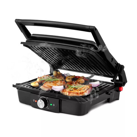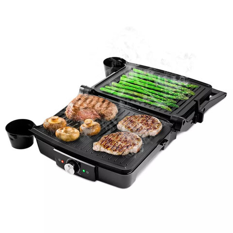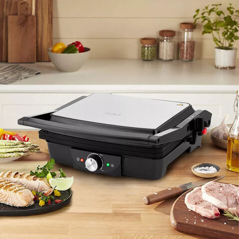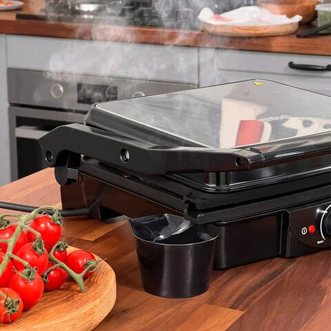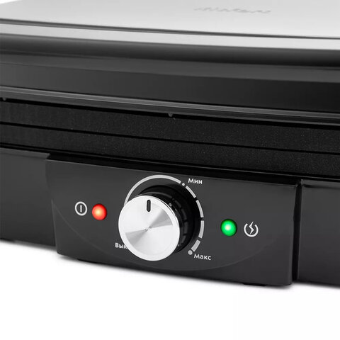 Модель мощностью 2000 Вт обеспечивает быстрый и равномерный нагрев, а ребристая поверхность панелей (279х229 мм) создаёт аппетитные "полоски" на продуктах, как при приготовлении на открытом огне. Панели выполнены из алюминия с антипригарным покрытием, что исключает прилипание и упрощает очистку – достаточно протереть их мягкой губкой, пока они ещё тёплые.