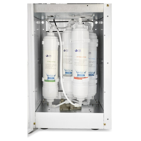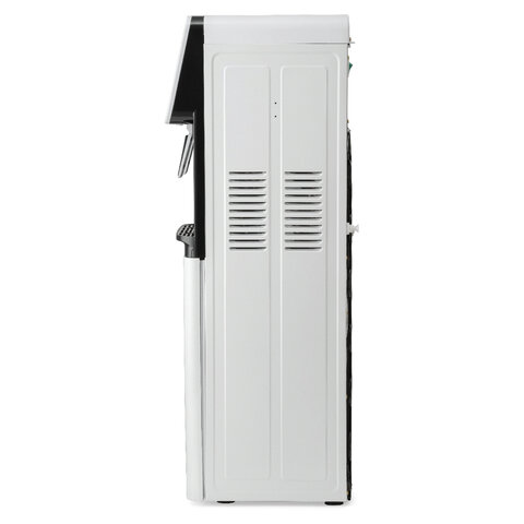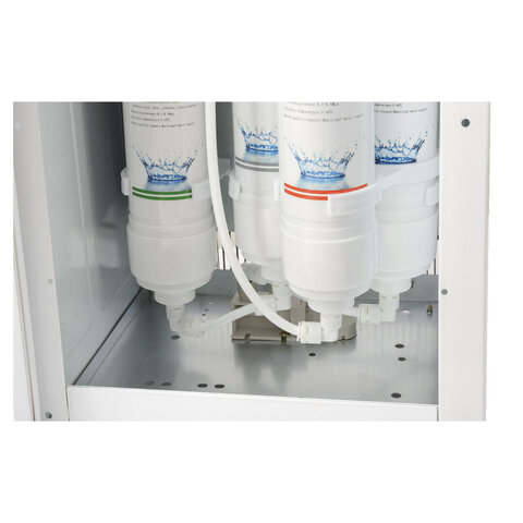 Пурифайер имеет индикацию отключения нагрева и охлаждения. Корпус выполнен в белом цвете с черной вставкой на передней панели.