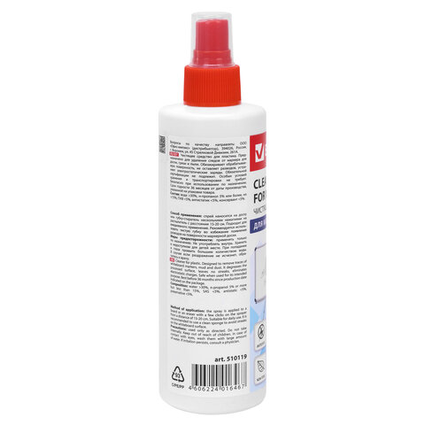 Удаляет следы сухого маркера, пыли, отпечатков пальцев и других загрязнений, а также дезинфицирует поверхность.