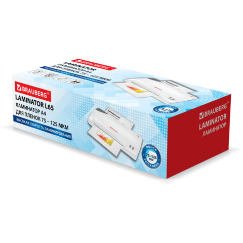 Данная модель обладает ВЫСОКОЙ скоростью прогрева и ламинирования, которые обычно характерны для высокотехнологичных и дорогостоящих моделей ламинаторов, при значительно более доступной цене ламинатора BRAUBERG L65. Способен заламинировать документы различных размеров от визитки до листа формата А4. Прогревается за 30 секунд. Ламинирует 1 документ формата А4 в пакетах 2x75, 2x80, 2x100 и 2х125 мкм за 35 секунд. Автовыключение после 30 минут простоя.