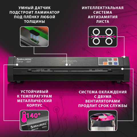 Инновационный ламинатор BRAUBERG SMART JET А3 МГНОВЕННО и АВТОМАТИЧЕСКИ подстраивается под плёнку ЛЮБОЙ толщины. Вкупе с быстрым нагревом и высочайшей скоростью он является лучшим выбором для ламинирования документов, меню, рисунков, фотографий.
