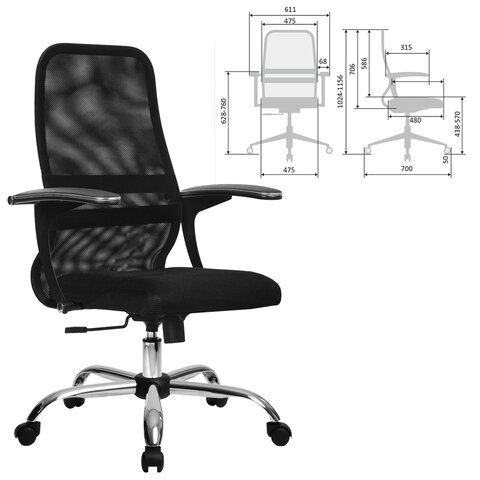 Материал обивки: ткань/сетка Цвет обивки: черный Максимальная нагрузка: до 150 кг Механизм качания: да Тип механизма: "Топ-ган" - качание с регулировкой под вес и фиксацией в 1 положении Сетка в спинке : да Крестовина (пятилучие): металл/хромированный металл Подлокотники: хром с накладками/металл с накладками Минимальная высота кресла: 1024 мм Максимальная высота кресла: 1156 мм Ширина кресла: 611 мм Минимальная высота до сиденья: 438 мм Максимальная высота до сиденья: 570 мм Сиденье ширина: 475 мм Сиденье глубина: 480 мм Спинка ширина: 475 мм Спинка высота: 706 мм Поставляется в разобранном виде: да Серия: SU-8 Соответствует требованиям ГОСТа: ГОСТ 19917-93