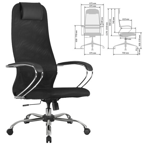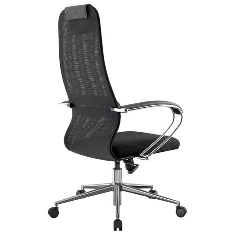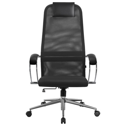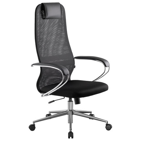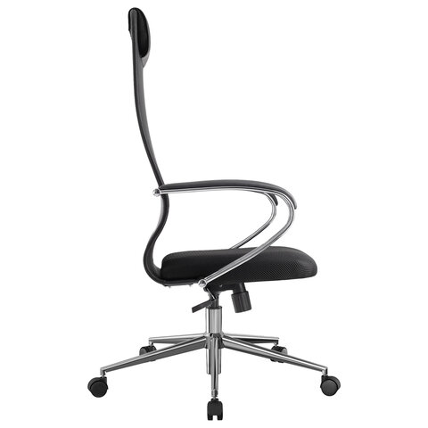 Спинка высокая, эргономичной формы, с ярко выраженной поясничной поддержкой. Спинка имеет сверхпрочный стальной каркас с износостойким полимерным покрытием черного цвета. Спинка снабжена мягким, комфортным подголовником. Сиденье средней жесткости, объемное, на столярном каркасе. Обивка спинки из износоустойчивой "дышащей" сетчатой ткани двойного плетения. Подлокотники стальные классические, покрытые зеркальным хромом, с мягкими накладками. Пятилучие металлическое хромированное. Модель оснащена механизмом качания "Top-Gun" с регулировкой под вес и возможностью фиксации в рабочем положении.