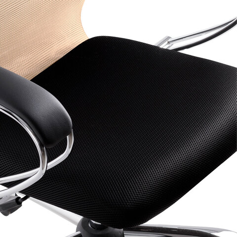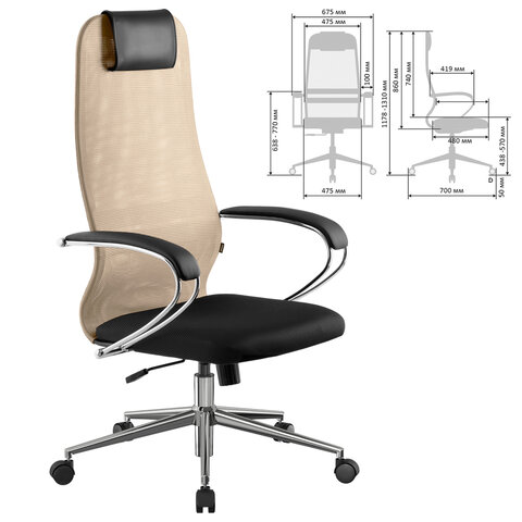 Материал обивки: ткань/сетка Х2 Максимальная нагрузка: до 150 кг Цвет обивки: черный/бежевый Тип механизма кресла: "Топ-ган" - качание с регулировкой под вес и фиксацией в 1 положении Сетчатая спинка: да Крестовина (пятилучие): металл/хромированный металл Подлокотники: хром с накладками Минимальная высота кресла: 1178 мм Максимальная высота кресла: 1310 мм Ширина кресла: 675 мм Минимальная высота до сиденья: 438 мм Максимальная высота до сиденья: 570 мм Сиденье ширина: 475 мм Сиденье глубина: 480 мм Спинка ширина: 475 мм Спинка высота: 860 мм Серия: EX-800 Соответствует требованиям ГОСТа: ГОСТ 19917-93 Поставляется в разобранном виде: да