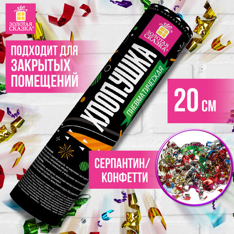 Пневматическая хлопушка ЗОЛОТАЯ СКАЗКА предназначена для создания отличного настроения и атмосферы настоящего веселья на любом празднике - новогодней вечеринке, торжестве в честь Дня Рождения, выпускном, корпоративе или любом другом праздничном событии.