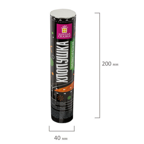 Хлопушка высотой 20 см с фольгированным наполнителем в виде серпантина и конфетти цвета ассорти является абсолютно безопасной. Выстрел осуществляется под действием сжатого воздуха. Не является пиротехникой. Средняя дальность выстрела – 5-7 м. Корпус хлопушки состоит из двух частей: пневматического баллона со сжатым воздухом и картонного цилиндра с наполнителем. Рекомендуется использовать хлопушку внутри больших помещений или на улице.