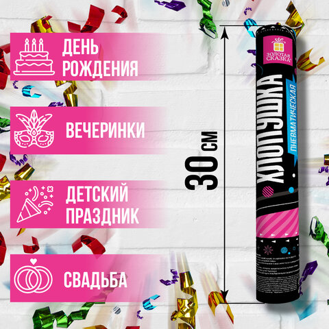 Пневматическая хлопушка ЗОЛОТАЯ СКАЗКА предназначена для создания отличного настроения и атмосферы настоящего веселья на любом празднике - новогодней вечеринке, торжестве в честь Дня Рождения, выпускном, корпоративе или любом другом праздничном событии.