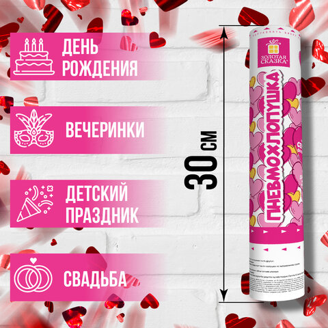 Хлопушка высотой 30 см с фольгированным наполнителем в виде сердечек красного цвета является абсолютно безопасной. Выстрел осуществляется под действием сжатого воздуха. Не является пиротехникой. Средняя дальность выстрела – 5-7 м. Корпус хлопушки состоит из двух частей: пневматического баллона со сжатым воздухом и картонного цилиндра с наполнителем. Рекомендуется использовать хлопушку внутри больших помещений или на улице.