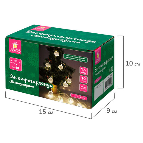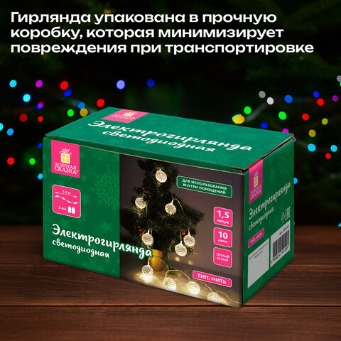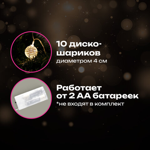 Использование: помещение Тип электрогирлянды: Нить "Декоративная" Количество режимов: 1 Длина: 1.5 м Мощность: 0.6 Вт Количество ламп: 10 шт. Тип ламп: светодиодная Форма ламп/фигуры: диско-шары Цвет ламп: теплый белый Цвет провода: прозрачный Питание: батарейки AA, 2 шт. Упаковка единицы товара: картонная коробка
