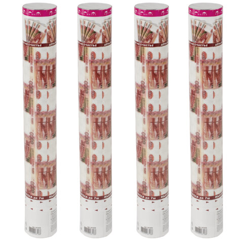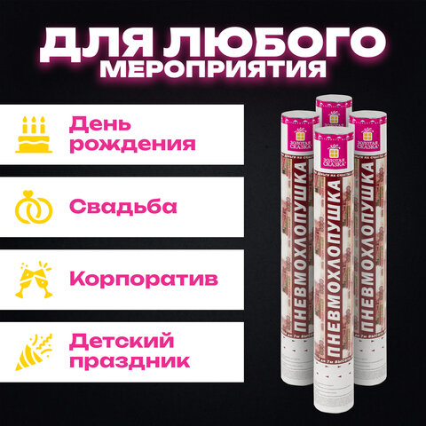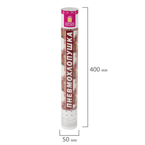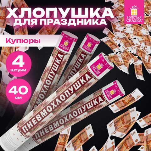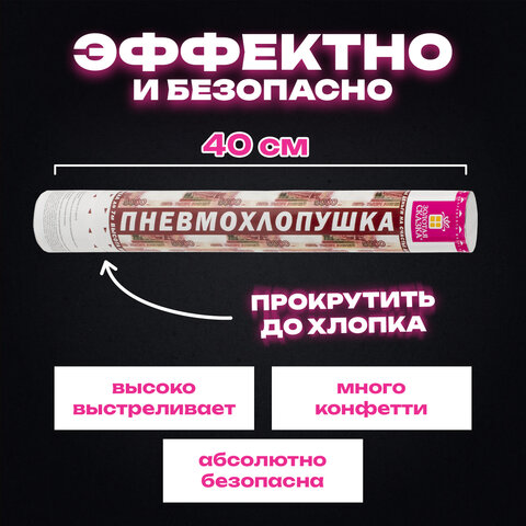 Комплект хлопушек высотой 40 см с бумажным наполнителем в виде купюр является абсолютно безопасным. Выстрел осуществляется под действием сжатого воздуха. Не является пиротехникой. Средняя дальность выстрела – 5-7 м. Корпус хлопушки состоит из двух частей: пневматического баллона со сжатым воздухом и картонного цилиндра с наполнителем. Рекомендуется использовать хлопушку внутри больших помещений или на улице.