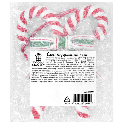 Тип украшения: карамельная трость Количество в наборе: 1 шт. Материал: полимерная глина Высота: 12 см Ширина: 10 см Цвет: ассорти Серия: Украшения из полимерной глины Упаковка: воздушно-пузырчатая плёнка