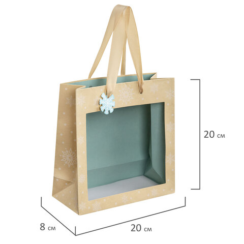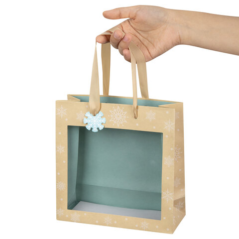 Пакет изготовлен из крафт-бумаги, украшенной нежными узорами снежинок, снабжен ленточными ручками из полиэстера. Размер – 20x8x20 см. Внутри пакет выполнен в светло-голубом цвете. С лицевой стороны пакета – прозрачное "окно", через которое виден голубой цвет внутренней части пакета – оригинальный акцент, привлекающий внимание.
