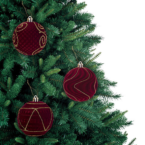 В наборе: 6 шаров цвета бургунди диаметром 8 см с эффектом софт-тач и золотистыми рисунком.