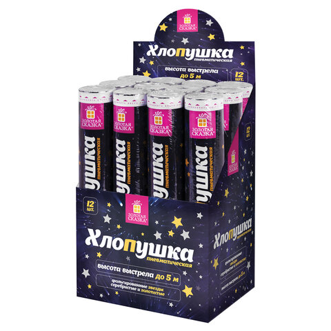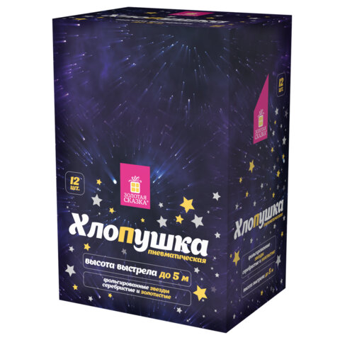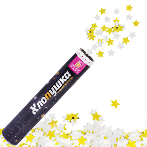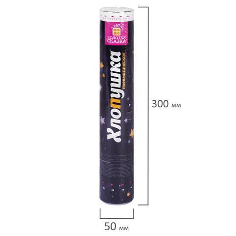 Хлопушка высотой 30 см с фольгированным наполнителем в виде звезд золотистого и серебристого цветов является абсолютно безопасной. Выстрел осуществляется под действием сжатого воздуха. Не является пиротехникой. Средняя дальность выстрела – 3-5 м. Корпус хлопушки состоит из двух частей: пневматического баллона со сжатым воздухом и картонного цилиндра с наполнителем. Рекомендуется использовать хлопушку внутри больших помещений или на улице.