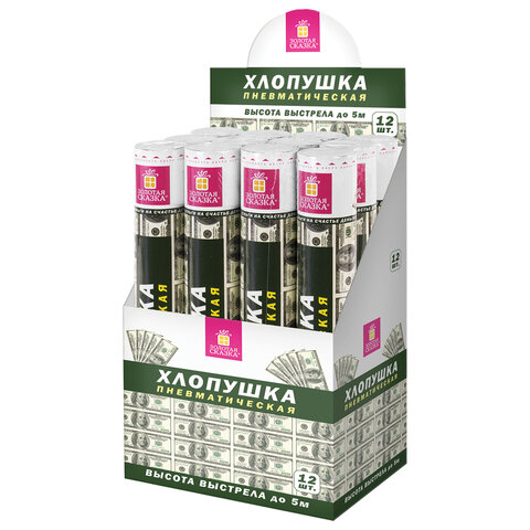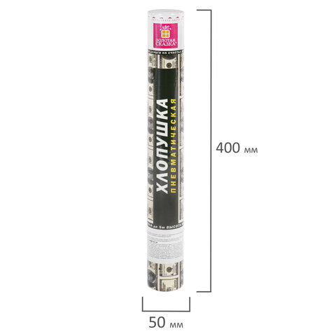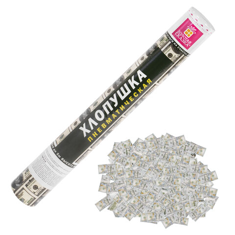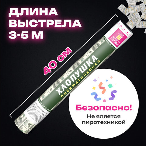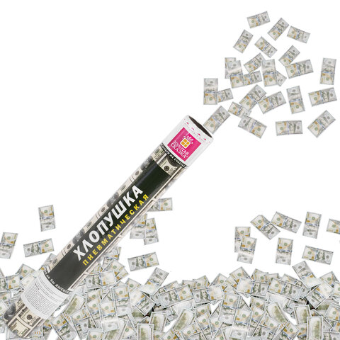 Хлопушка высотой 40 см с бумажным наполнителем в виде купюр "долларов" является абсолютно безопасной. Выстрел осуществляется под действием сжатого воздуха. Не является пиротехникой. Средняя дальность выстрела – 3-5 м. Корпус хлопушки состоит из двух частей: пневматического баллона со сжатым воздухом и картонного цилиндра с наполнителем. Рекомендуется использовать хлопушку внутри больших помещений или на улице.