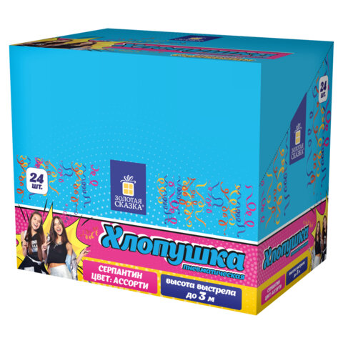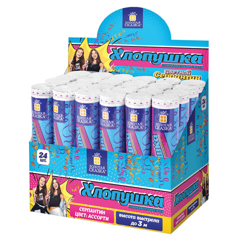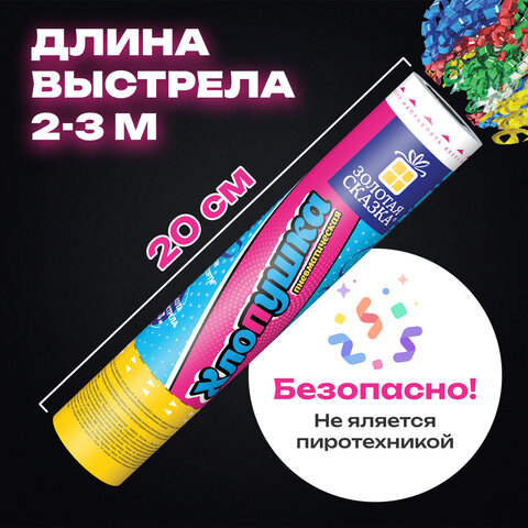Хлопушка высотой 20 см с фольгированным наполнителем в виде длинного серпантина цвета ассорти является абсолютно безопасной. Выстрел осуществляется под действием сжатого воздуха. Не является пиротехникой. Средняя дальность выстрела – 2-3 м. Корпус хлопушки состоит из двух частей: пневматического баллона со сжатым воздухом и картонного цилиндра с наполнителем. Рекомендуется использовать хлопушку внутри больших помещений или на улице.