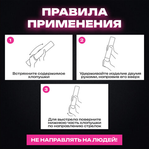 Пневматическая хлопушка не является пиротехникой и работает на основе энергии сжатого воздуха. Конфетти и серпантин ярких цветов можно использовать в помещении или на улице. Хлопушка подойдет для праздников, концертов, реквизита для фотосессии.