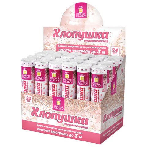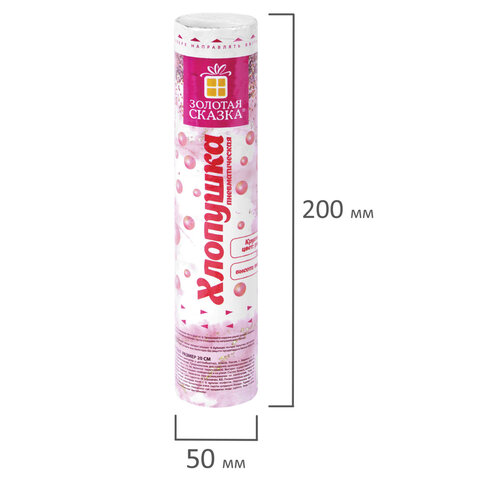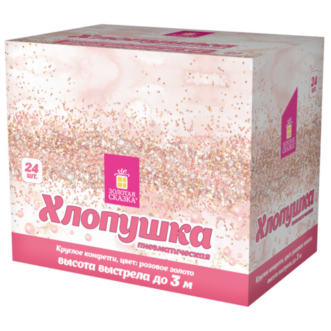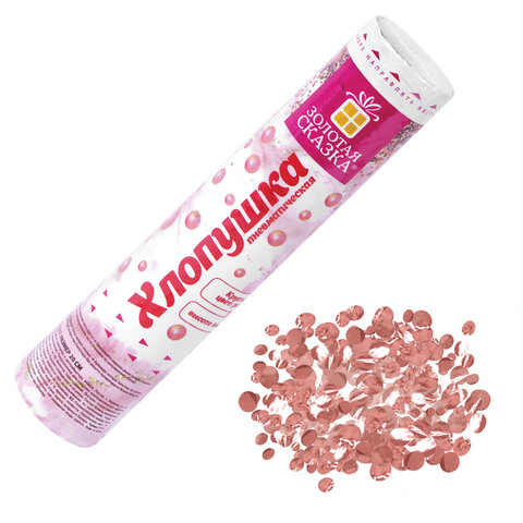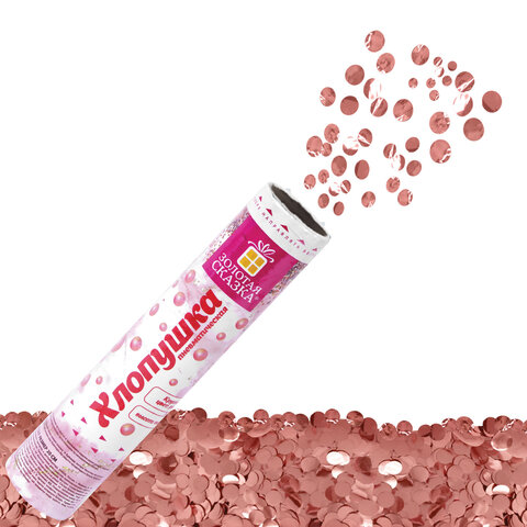 Хлопушка высотой 20 см с фольгированным наполнителем в виде кругов цвета розовое золото является абсолютно безопасной. Выстрел осуществляется под действием сжатого воздуха. Не является пиротехникой. Средняя дальность выстрела – 2-3 м. Корпус хлопушки состоит из двух частей: пневматического баллона со сжатым воздухом и картонного цилиндра с наполнителем. Рекомендуется использовать хлопушку внутри больших помещений или на улице.