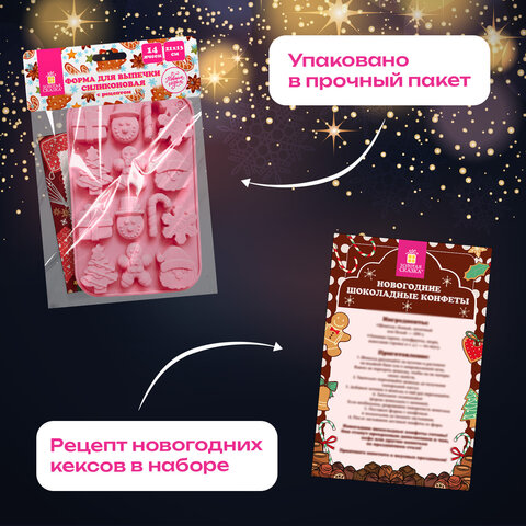 Форма для выпечки новогодняя 21х13 см "Xmas Sweets", силикон, 14 ячеек, рецепт, ЗОЛОТАЯ...