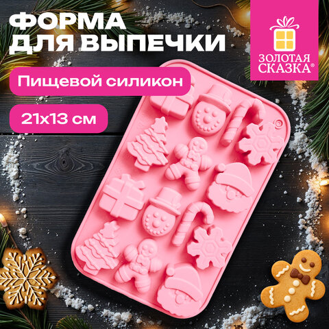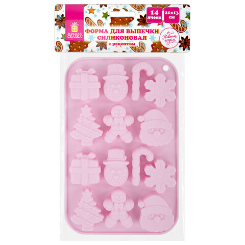 Формочка для выпечки ЗОЛОТАЯ СКАЗКА выполнена в интересном рождественском дизайне с 14 аккуратными ячейками разных дизайнов (подарок, забавный снеговик, карамельная трость, снежинка, праздничная елочка, веселый Дед Мороз, пряничный человечек).