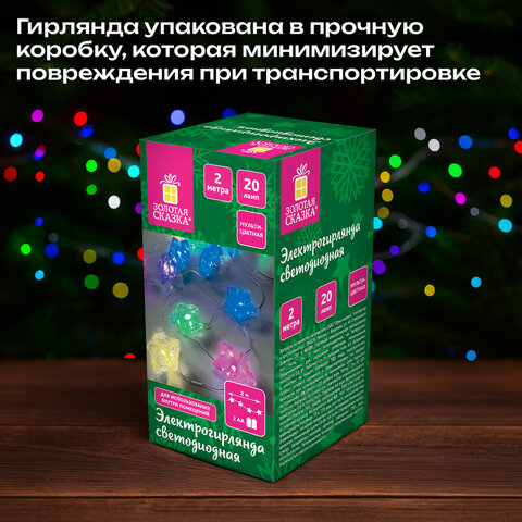 Цвет свечения гирлянды – мультицветный. Конструкцией гирлянды не предусмотрено наличие контроллера для переключения режимов – режим свечения один, и он постоянный. Гирлянда работает от 2 батареек типа AA. Батарейки не входят в комплект!