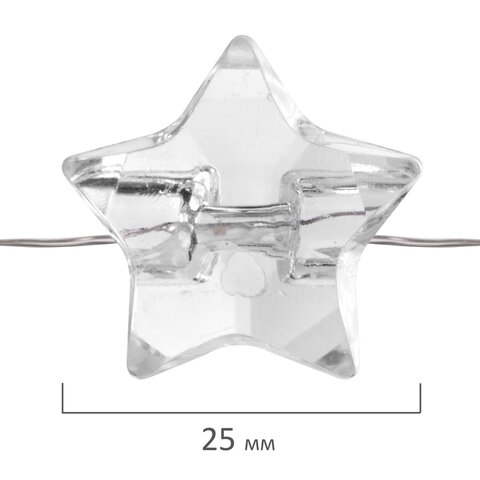 Электрическая светодиодная гирлянда представляет собой светодиоды, соединенные между собой электрическим проводом. Тип конструкции – "Нить". Длина рабочей части гирлянды составляет 2 м. Количество светодиодных ламп в виде "звёзд" – 20 шт. Размер звезды – 2,5 см. Лампы сделаны на основе технологии LED, которая является более безопасной и эффективной по сравнению с лампой накаливания.