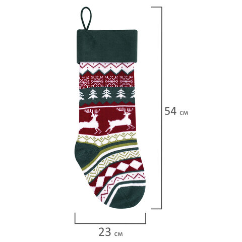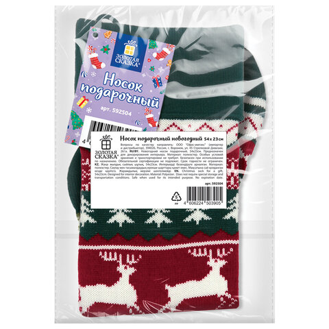 Размер – 23х2х54см, материал – полиэстер. Цвет – зеленый, красный. К носку прикреплена этикетка. Также носок упакован в пакет с клейким краем.