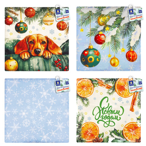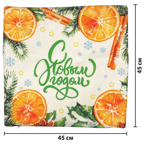 Чехлы новогодние размером 45х45 см идеально подходит для стандартных декоративных подушек. Чехлы выполнены из полиэстера и украшены яркими новогодними мотивами: апельсины, елочные шары, милая собачка и, конечно же, снежинки (ассорти без возможности выбора).
