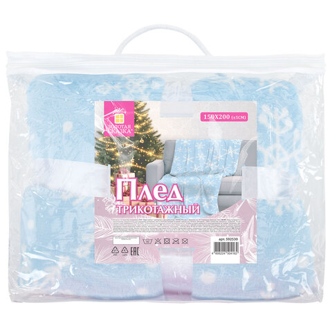 Плед упакован в плотный полиэтиленовый мешок с полипропиленовыми ручками и молнией. Внутри плед обвязан атласной ленточкой, что делает его отличным готовым новогодним подарком!
