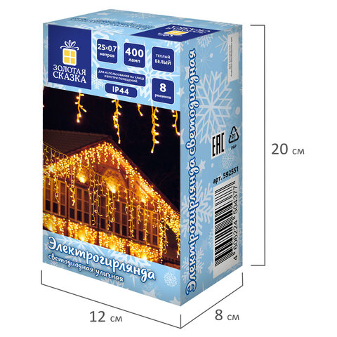 Длина основного провода рабочей части гирлянды составляет 25х0,7 м, длина кабеля питания – 3 м. Количество светодиодных ламп – 400 шт. Лампы сделаны на основе технологии LED, которая является более безопасной и эффективной по сравнению с лампой накаливания.