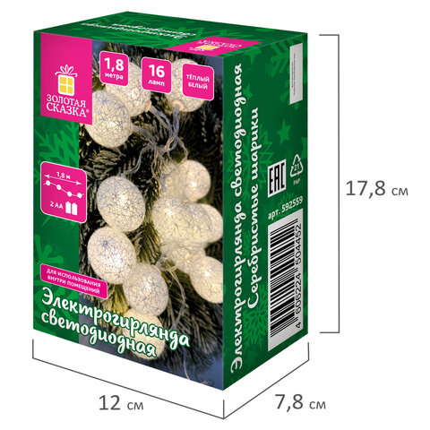 Использование: помещение Тип электрогирлянды: Нить "Декоративная" Количество режимов: 1 Длина: 1.8 м Мощность: 0.8 Вт Количество ламп: 16 шт. Тип ламп: светодиодная Форма ламп/фигуры: шарик Цвет ламп: теплый белый Цвет провода: прозрачный Питание: батарейки AA, 2 шт. Упаковка единицы товара: картонная коробка