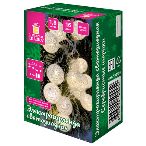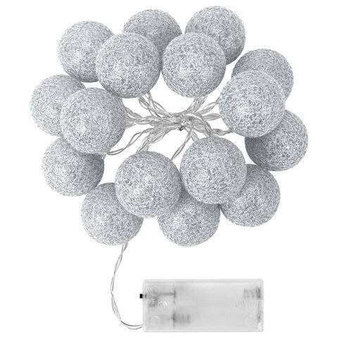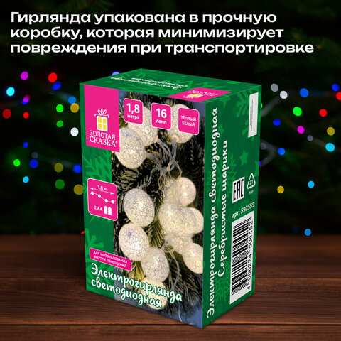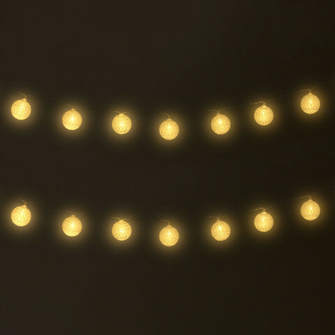 Электрическая светодиодная гирлянда представляет собой светодиоды, соединенные между собой электрическим проводом. Тип конструкции – "Нить". Длина рабочей части гирлянды составляет 1,8 м. Количество светодиодных ламп в виде шариков из хлопчатобумажного материала – 16 шт. Диаметр шарика – 4 см. Лампы сделаны на основе технологии LED, которая является более безопасной и эффективной по сравнению с лампой накаливания.