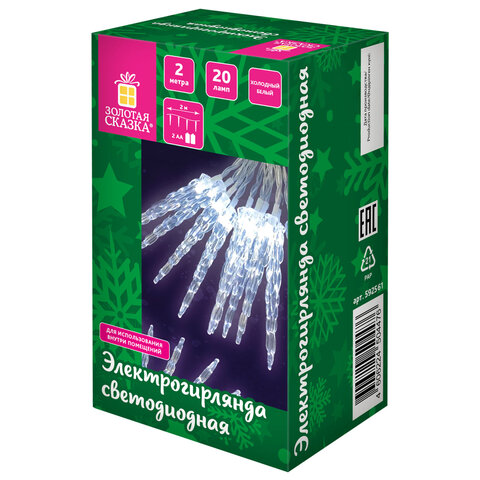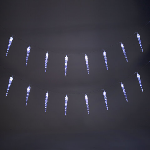 Использование: помещение Тип электрогирлянды: Нить "Декоративная" Количество режимов: 1 Длина: 2 м Мощность: 0.6 Вт Количество ламп: 20 шт. Тип ламп: светодиодная Форма ламп/фигуры: сосульки Цвет ламп: холодный белый Цвет провода: прозрачный Питание: батарейки AA, 2 шт. Упаковка единицы товара: картонная коробка