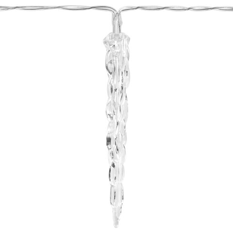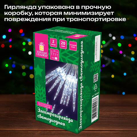 Длина рабочей части гирлянды составляет 2 м. Количество светодиодных ламп – 20 шт. Длина соскульки – 11 см. Лампы сделаны на основе технологии LED, которая является более безопасной и эффективной по сравнению с лампой накаливания.