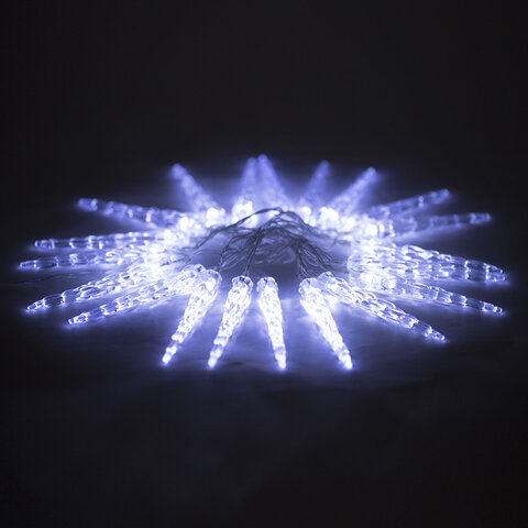 Электрическая светодиодная гирлянда представляет собой светодиоды, соединенные между собой электрическим проводом. Тип конструкции – "Нить". Лампы украшены прозрачными декоративными колпачками в виде сосулек.