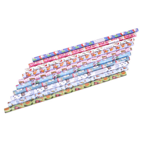 Изготовлена из мелованной бумаги и представлена в 10 универсальных новогодних дизайнах. Бумага плотностью 105 г/м2 упакована в рулоны длиной 100 см и шириной 70 см (± 5%). Поставляется в нескольких вариантах дизайна (без возможности выбора).