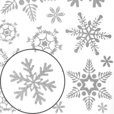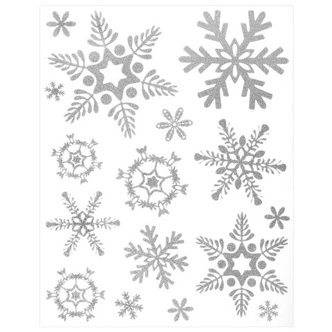Комплект наклеек с изображением снежинок изготовлен из поливинилхлорида (ПВХ). Каждый лист с наклейками размером 30x38 см декорирован серебристым глиттером. В комплекте 4 листа, на каждом – 16 снежинок.