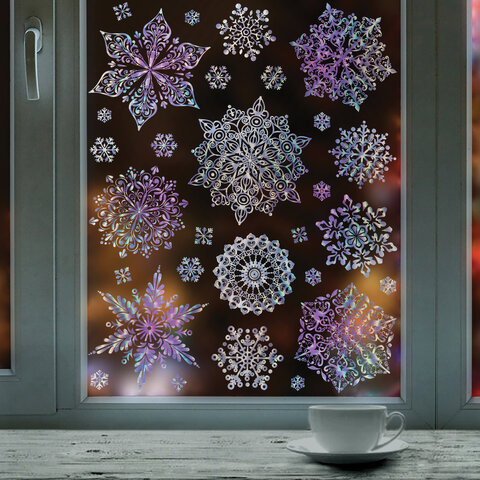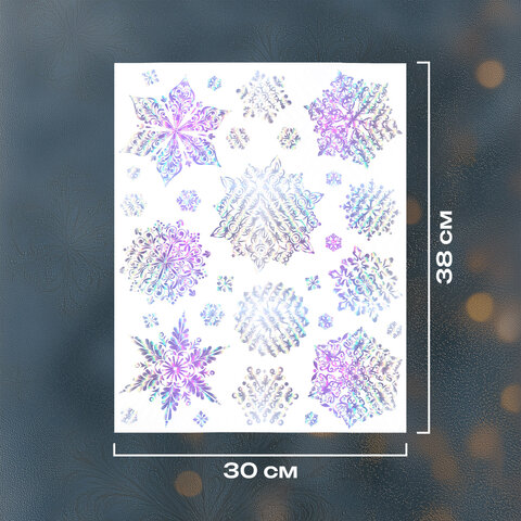 Тип товара: наклейка для окон Материал: пленка ПВХ Длина: 38 см Ширина: 30 см Цвет: мультицветный Способ крепления: статический Дизайн: Снежинки голография