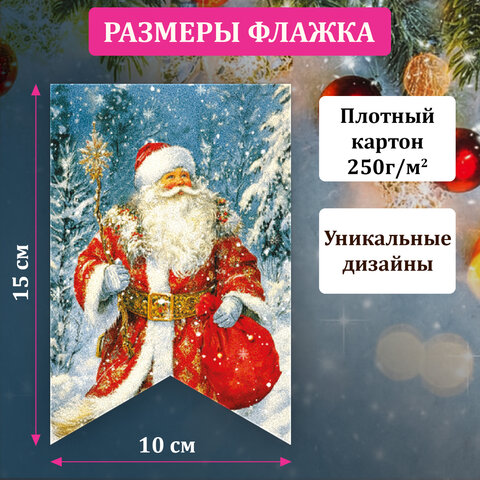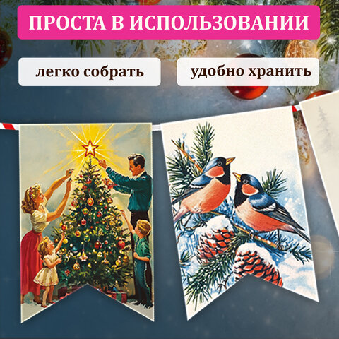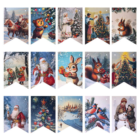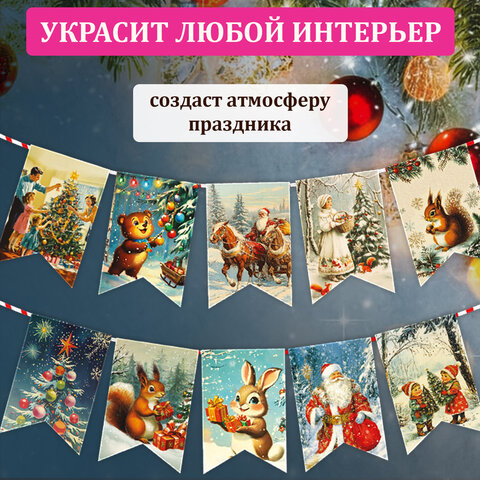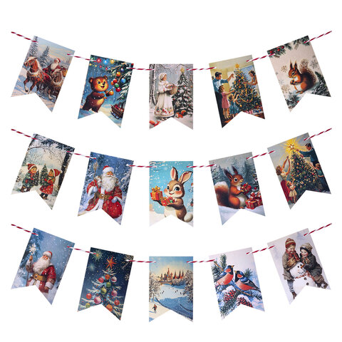 Гирлянда-растяжка состоит из 15 флажков размером 10х15 см, выполненных из плотного картона с яркими иллюстрациями в советской стилистике: Дед Мороз, Снегурочка, ёлочки, лесные зверушки и другие зимние символы, которые будто переносят нас в те далёкие, но такие родные новогодние вечера.