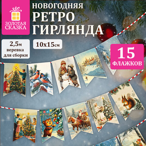 Гирлянда-растяжка новогодняя ЗОЛОТАЯ СКАЗКА с ретро-иллюстрациями создаст атмосферу доброго и по-домашнему уютного праздника. Это не просто бумажная гирлянда – это маленькая частица зимней сказки, которую можно повесить на стену.