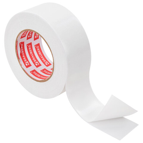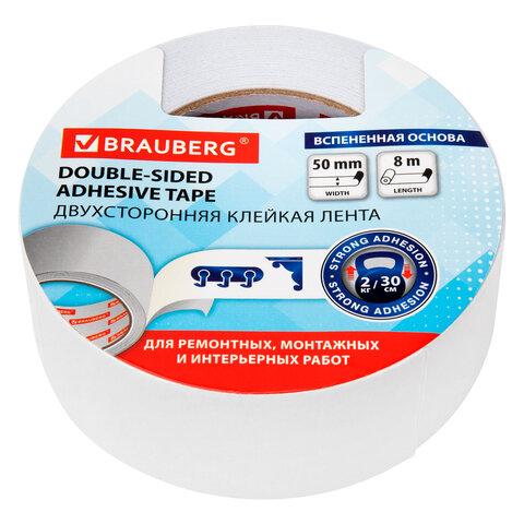 Двухсторонняя клейкая лента BRAUBERG на основе вспененного полиэтилена применяется во время мотажных работ внутри помещений, при строительных, и автомобильных работах.