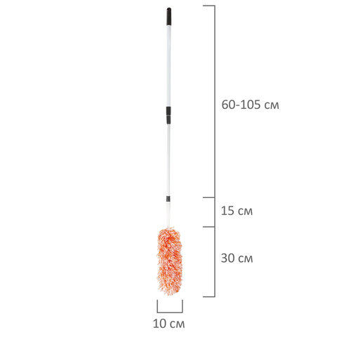 Рукоятка телескопическая отдельно от пипидастра имеет размеры 60-105 см, в сборе с учетом корпуса – 75-120 см.