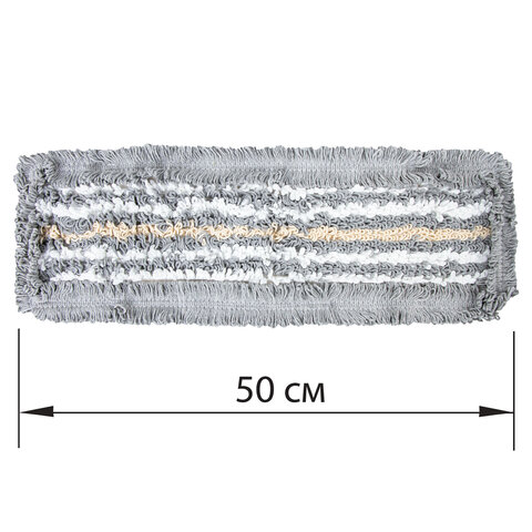 Моп имеет форму плоского прямоугольника, такая форма и чистящая поверхность позволяет удобно собрать грязь по углам и захватить большую площадь убираемой поверхности, что в свою очередь уменьшает временные затраты на уборку больших площадей. Устойчива к износу, что обеспечивает долгий срок службы уборочного инструмента. Выдерживает до 300 циклов стирки. Выполнена из хлопка с добавлением микрофибры и имеет размер 50х15 см. Максимальный объем впитывания – 550 мл.