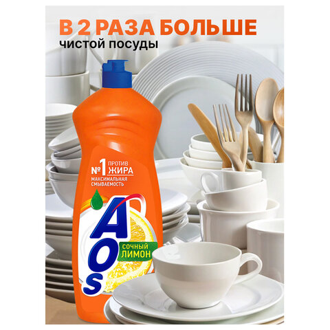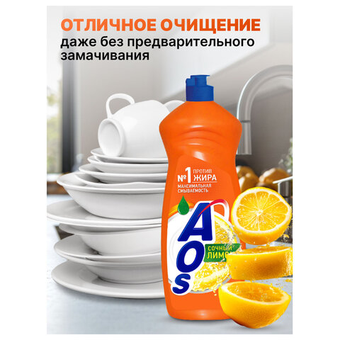 Благодаря особой формуле средство для мытья посуды AOS "Лимон" с легкостью отмывает даже самые сложные загрязнения и глубоко въевшийся жир.