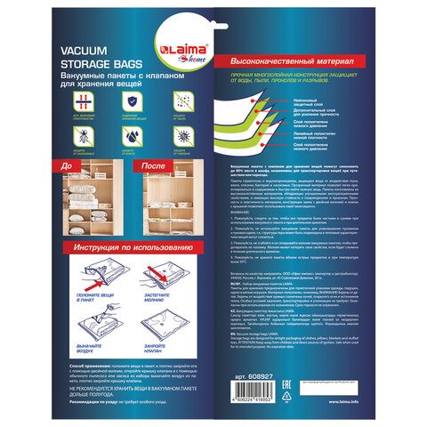 Вакуумные пакеты LAIMA HOME с клапаном предназначены для герметичной упаковки одежды, подушек, одеял и мягких игрушек. Помогут сэкономить до 80% места в шкафу, незаменимы при транспортировке вещей в путешествии и при переезде.